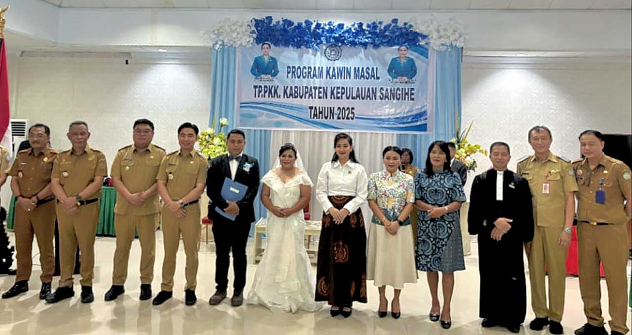 SANGIHE – Sebanyak 13 pasang pengantin dari Tahuna dan sekitarnya mengikuti kawin massal yang digelar oleh Tim Penggerak PKK Kabupaten Kepulauan Sangihe bekerja sama dengan Dukcapil. Acara ini berlangsung di Pendopo Rumah Jabatan Bupati, Selasa (4/11/2025).