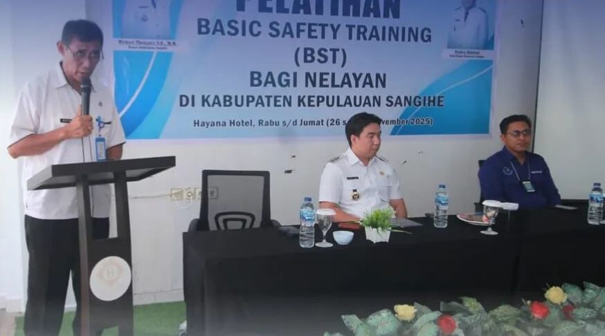 SANGIHE — Upaya meningkatkan kapasitas dan keselamatan kerja para nelayan di Kabupaten Kepulauan Sangihe kembali diperkuat melalui penyelenggaraan Pelatihan Basic Safety Training (BST) Kelas II, yang secara resmi dibuka oleh Bupati Kepulauan Sangihe, Michael Thungari, S.E., M.M., di Roof Top Hotel Hayana, Rabu (26/11/2025).