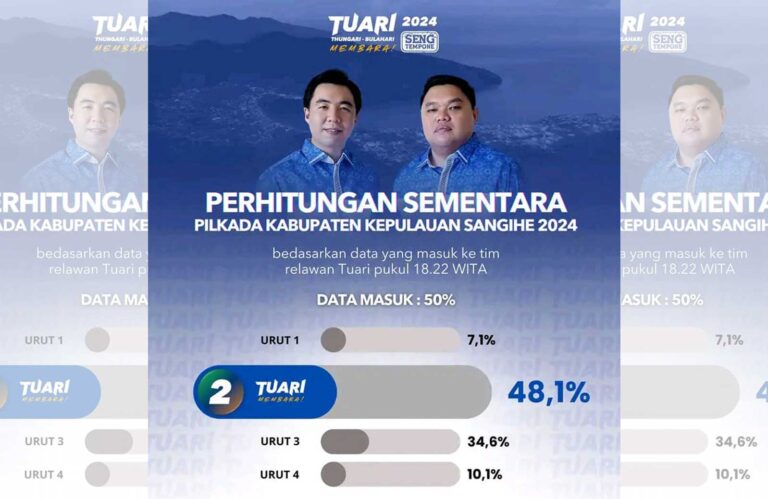 Perhelatan pilkada di kabupaten induk kepulauan Sangihe yang diikuti empat kontestan, Menggana,Tuari, Tamang dan Menadia, dalam hitungan cepat, menempatkan Pasangan Michael Thungari – Tendris Bulahari (Tuari) benar benar top skor jauh meninggalkan tiga Kontestan. Perolehan suara yang masuk di internal siber Tuari, hingga hari ini 28/10/2024 Tuari sudah melampaui ketiga rivalnya yakni 48,1 persen.