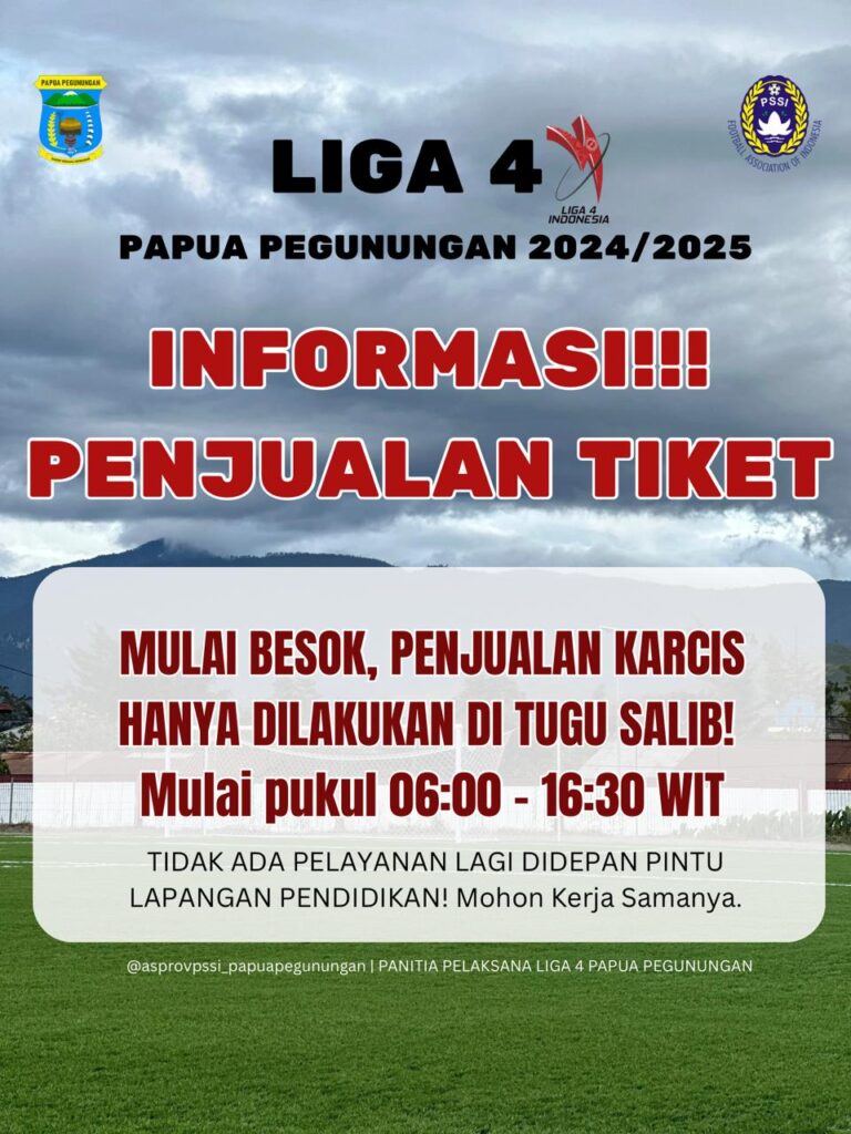 Terhitung mulai Senin (24/03-2025), penjualan tiket masuk nonton pertandingan sepakbola Liga 4 PSSI Papua Pegunungan, hanya dipusatkan di depan Tugu Salib Wamena.