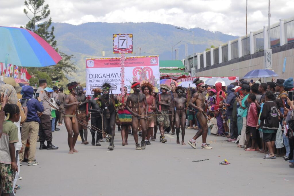 “Ribuan pelajar mulai dari PAUD, TK, SD, SMP, SMA/SMK, perguruan tinggi, instansi pemerintah dan organisasi kemasyarakatan se-Kabupaten Jayawijaya mengikuti parade karnaval dengan menggunakan pakaian adat 40 distrik se-Kabupaten Jayawijaya dan daerah lain di nusantara dalam rangka menyambut HUT Proklamasi Kemerdekaan RI ke-80,” ujarnya.