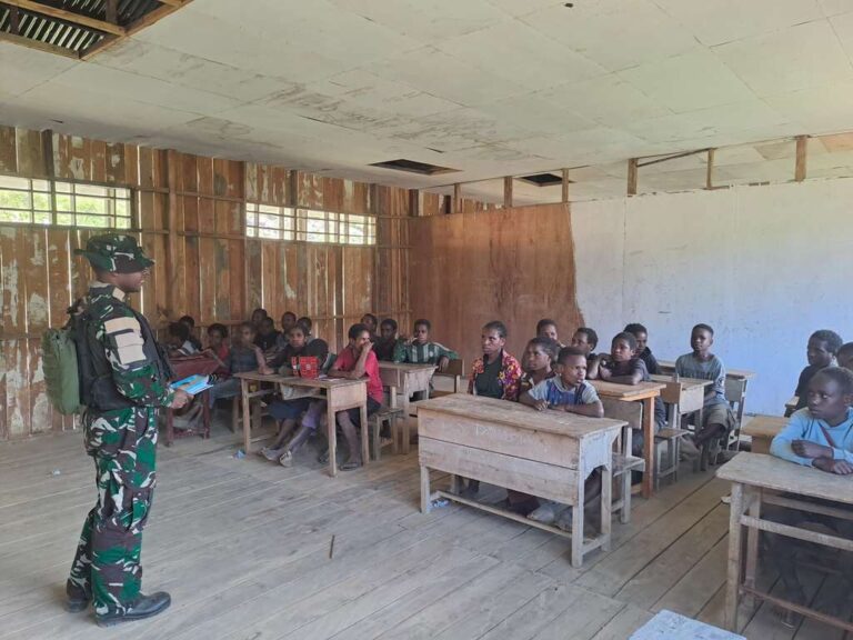 LANNY Jaya, Kliktimur.com – Satgas Pamtas RI-PNG Kewilayahan Yonif 511/DY Pos Balingga melaksanakan kegiatan mengajar di SD Inpres Brume, Distrik Balingga, Kabupaten Lanny Jaya, Papua Pegunungan, Jumat (17/10/2025).