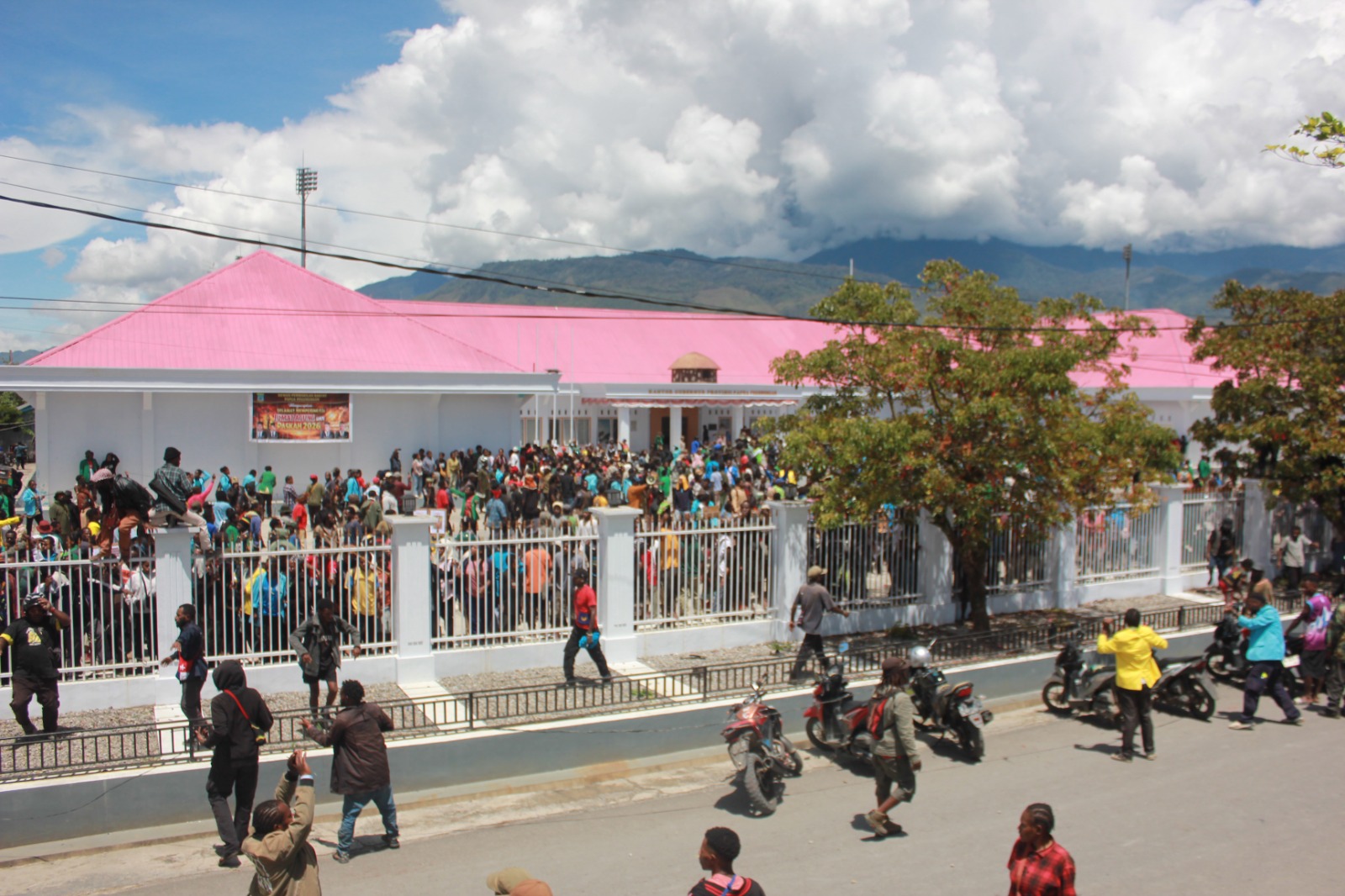 Caption: suasana aksi damai di gedung DPRP provinsi Papua pegunungan. Foto di ambil saat bentrokan sedang berlangsung