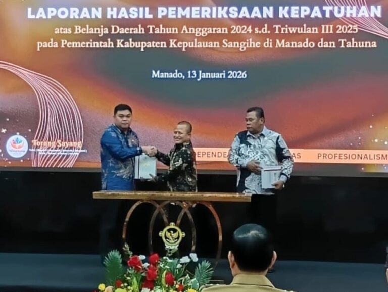 SANGIHE — Pemerintah Kabupaten Kepulauan Sangihe kembali menegaskan komitmennya terhadap pengelolaan keuangan daerah yang akuntabel dan transparan. Wakil Bupati Kepulauan Sangihe, Tendris Bulahari, secara resmi menerima Laporan Hasil Pemeriksaan (LHP) Kepatuhan atas Belanja Daerah Tahun Anggaran 2024 hingga Triwulan III Tahun 2025 dari Badan Pemeriksa Keuangan (BPK) RI.